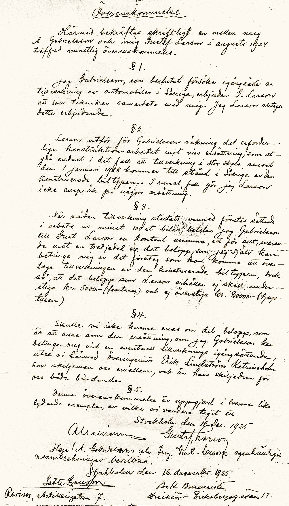 Assar gabrielsson och Gustaf Larson tecknade en överenskommelse om livslångt samarbete för tillverkning av automobiler i Sverige.