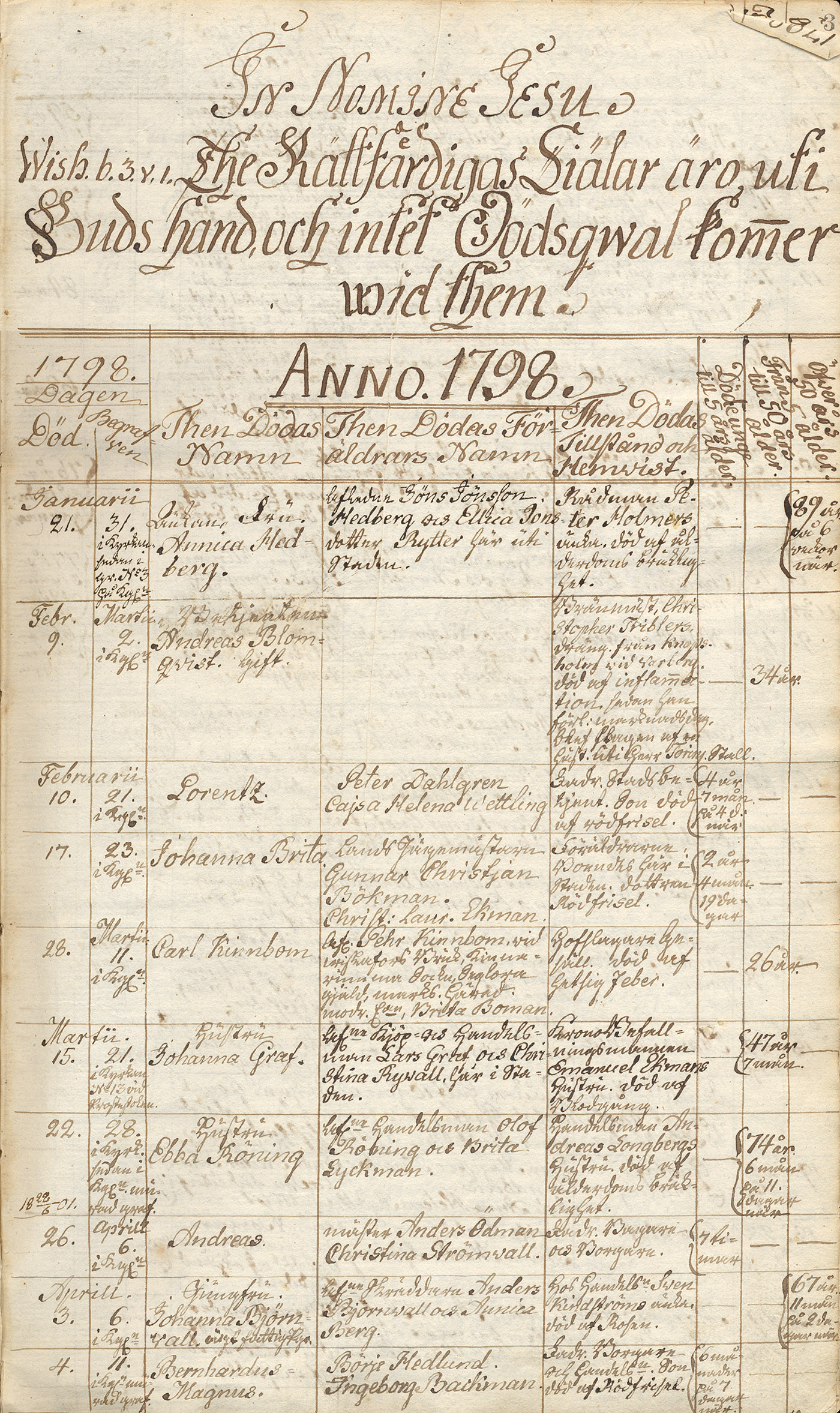 Borås död- och begravningsbok 1798 (Borås församling FI: 1) Död- och begravningsböckerna finns i församlingarnas kyrkoarkiv i allmänhet från och med 1688. Exempel på tidigare böcker finns. Dödböckerna fördes i kronologisk ordning och här upptages den dödes namn, ålder, hemvist och dödsorsak. Ibland förekommer även föräldrarnas namn. Renskrives utan skiljetecken.