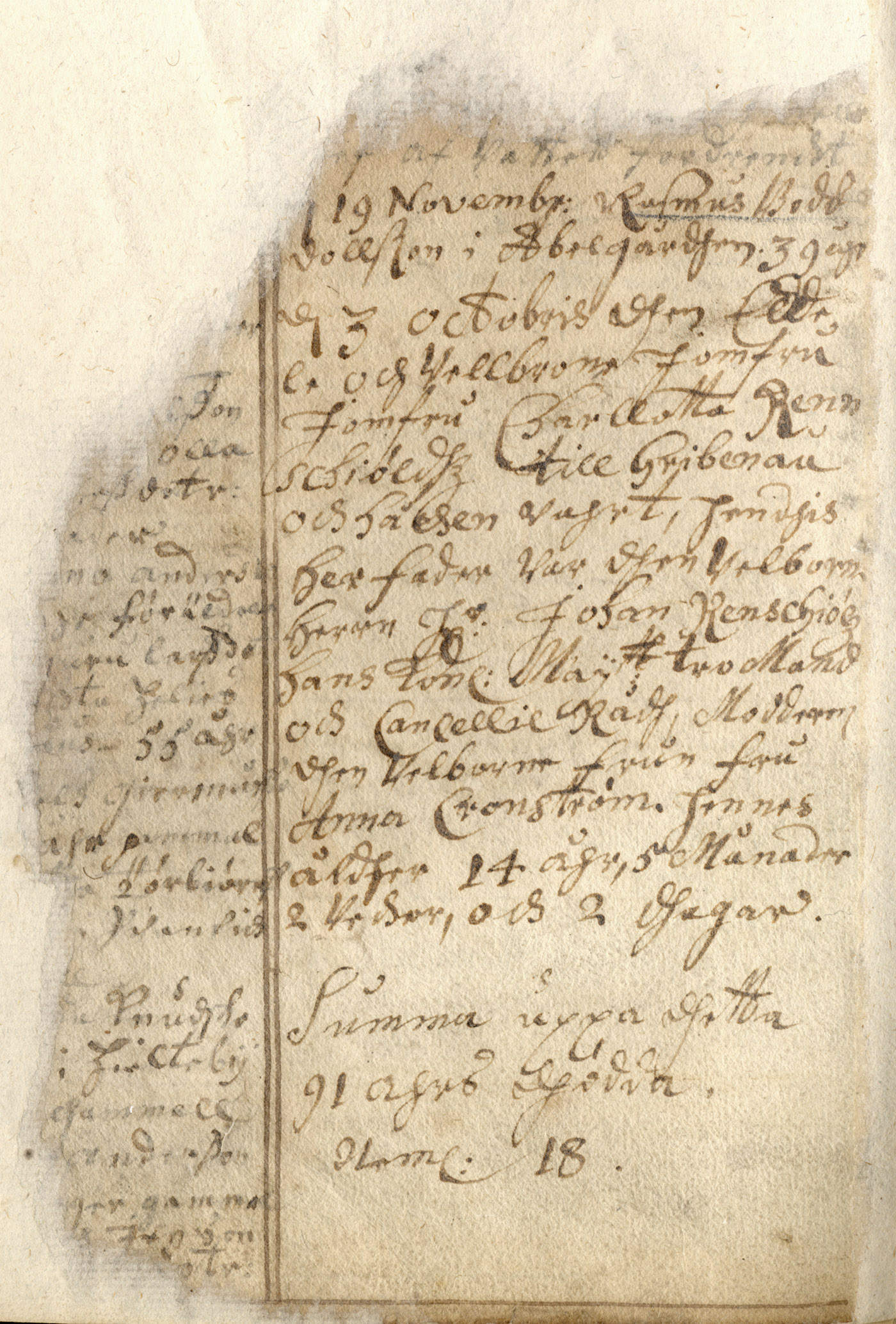 Valla kyrkobok (C:1 1691-1730) Boken består av 124 blad. Dessa är svårt skadade och många är fragmentariska särskilt i bokens början och slut. Boken är svårt fukt och brandskadad men läsbarheten kan genom digitaliseringen förbättras. Boken är förd kronologiskt i grupper av dop, vigslar och be-gravningar. Barnets namn, föräldrar och hemvist samt faddrar är noterade, likaså de vigdas namn och hemvist. I begravningsboken förekommer en ovanlig uppgift, då förutom den dödes namn, ålder och hemvist även föräldrarnas namn och hemvist anges.