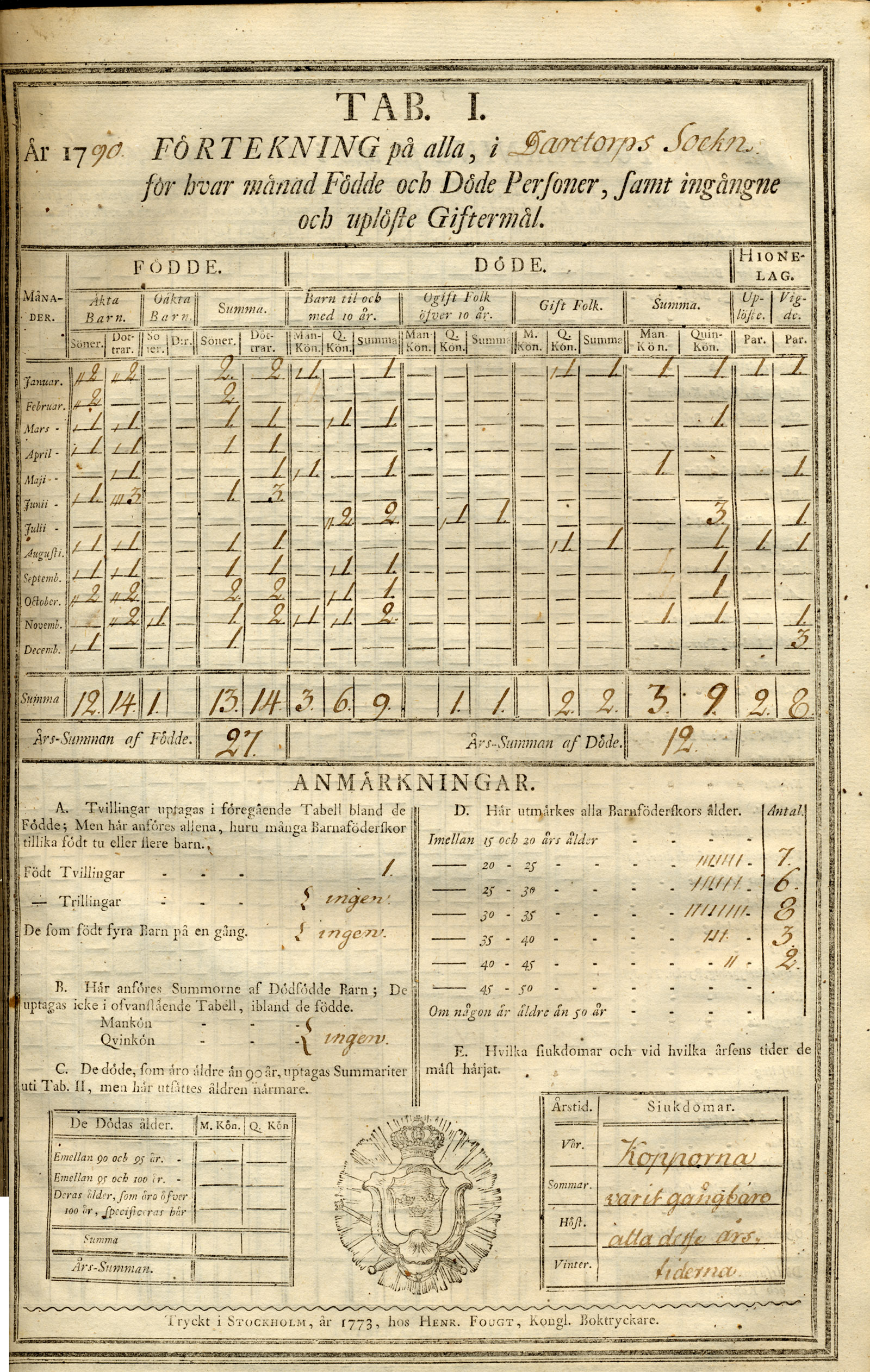 Befolkningsstatistiska tabeller för Daretorps församling 1789-1790