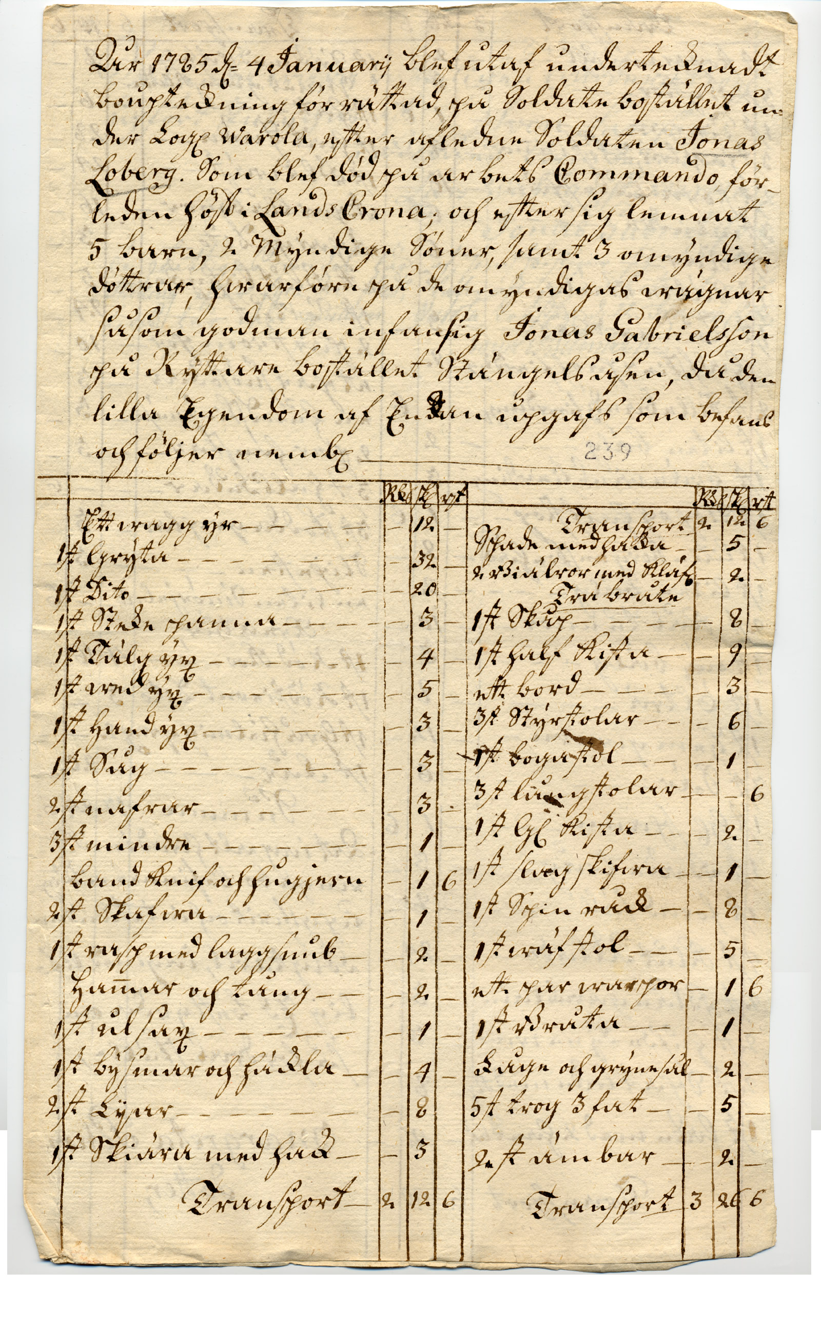Bouppteckning efter soldat (Kåkinds häradsrätts bouppteckningar 1785, F II: 4) Genom 1734 års lag blev det obligatoriskt att upprätta bouppteckning vid dödsfall. Ofta upprättades bouppteckning endast efter mannen eller hustrun. Även före 1736 förekommer bouppteckningar. Bouppteckningen är mycket detaljerad och upptager alla ägodelar vid dödstillfället, från fastigheter, mynt, skulder och fordringar till gångkläder, kreatur och yrkesverktyg.