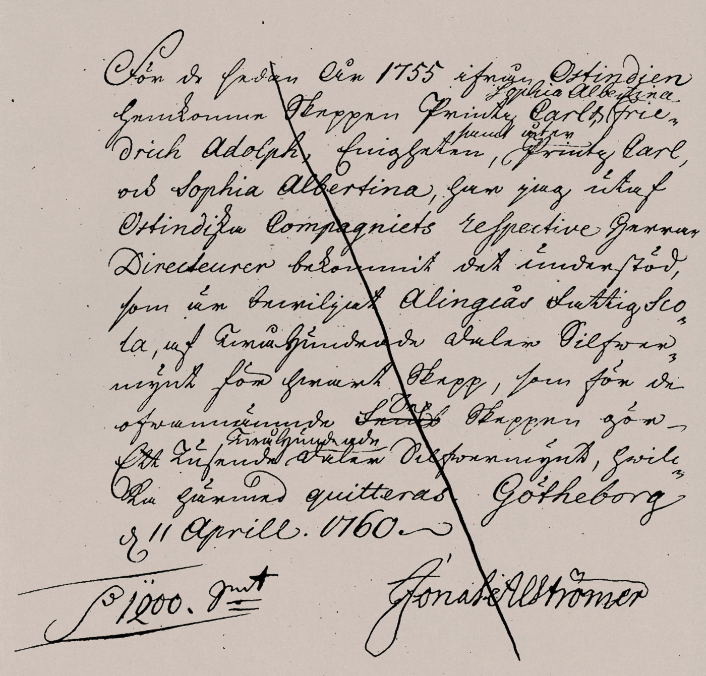 Handlingar rörande Ostindiska kompaniet 1760 (Östadsarkivet A 152) Ostindiska kompaniets arkiv finns ej bevarat; i dess stadgar angavs att arkivet skulle förstöras och ej bevaras för framtiden. Trots detta har sporadiskt vissa handlingar kommit att tagas till vara genom att kompaniets delägare m fl sparat vissa handlingar. Så till exempel har familjerna Sahlgrens och Alströmers arkivbestånd bevarats i Östadsarkivet och familjen Thams i Öijaredsarkivet. Handlingarna är spridda över hela landet och består av skilda typer av handlingar t ex rullor, proviantlistor, korrespondens, verifikationer, auktionsprotokoll mm.Till stor del är dokumenten förda med latinsk stil.