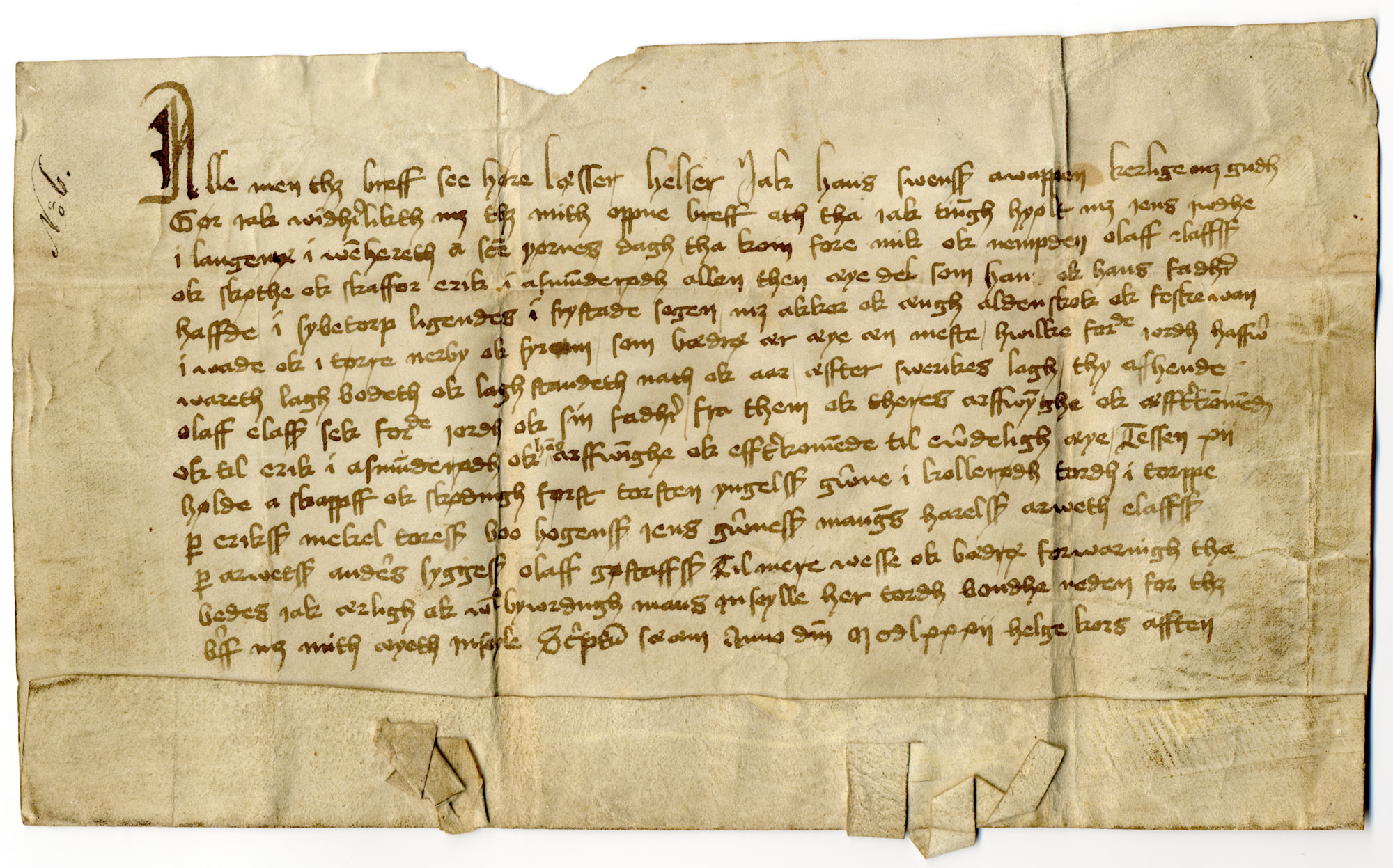 breff mz mith aeyeth jnsegle. Scriptum Saeaem anno Dm m c d LXXXII helge korss afften.